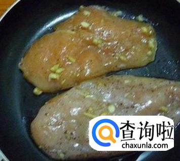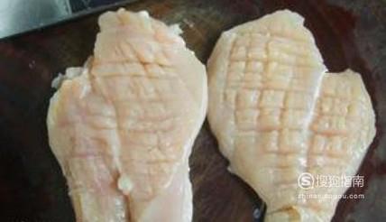 首先把鸡胸肉清洗干净,然后用刀在鸡胸肉表面横竖划均匀。