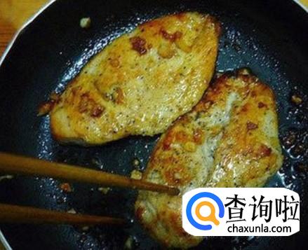 然后开火下油,把鸡排摆到锅里用小火煎。