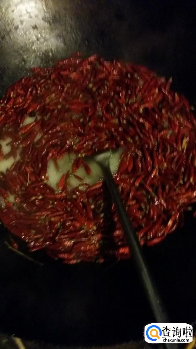 锅中加入少许豆油,油温5层热时加入火锅底料少许进行炒制,并加入泡好干净的干辣椒,炒出香味。