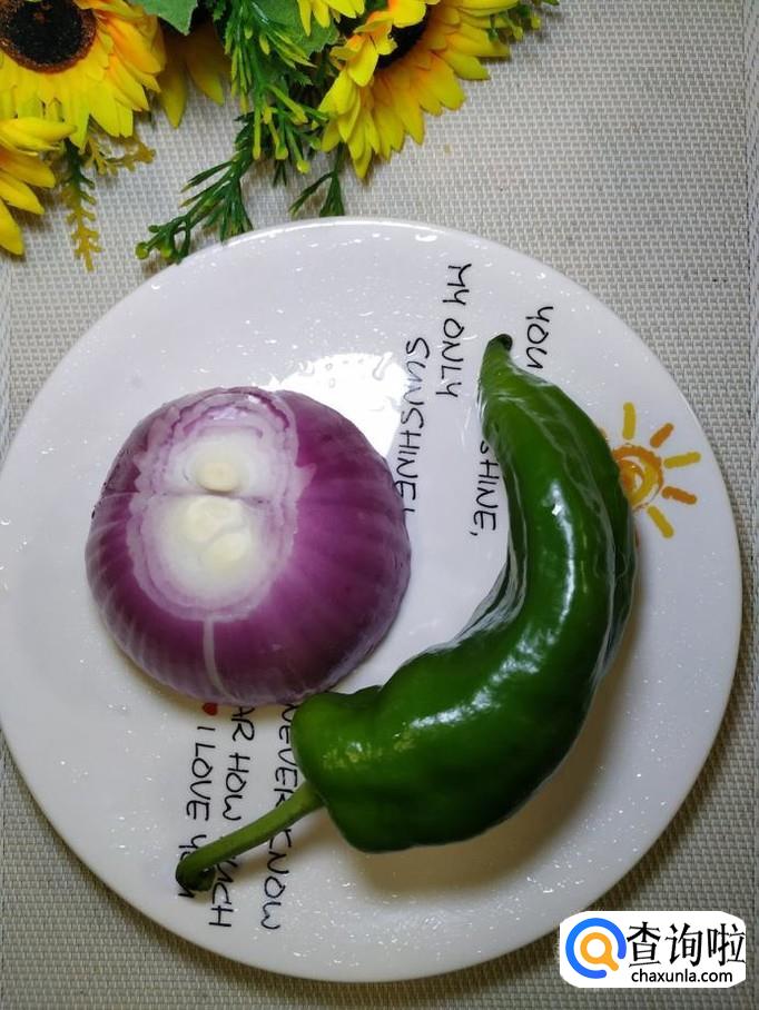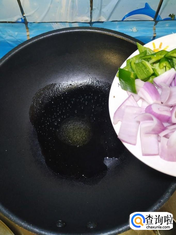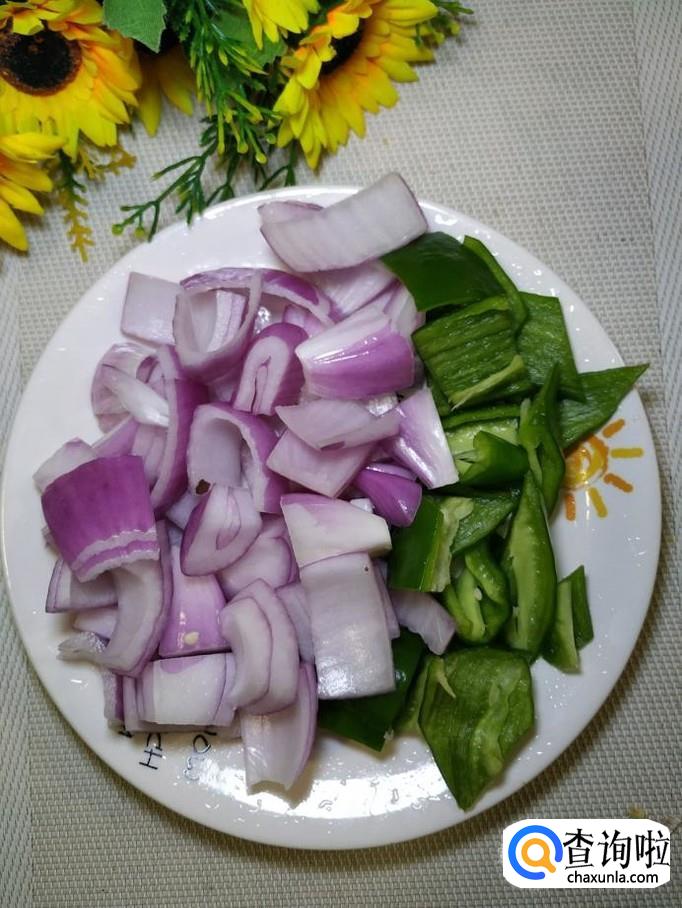 准备适量洋葱和青椒,洗净后切块,放入盘中备用。