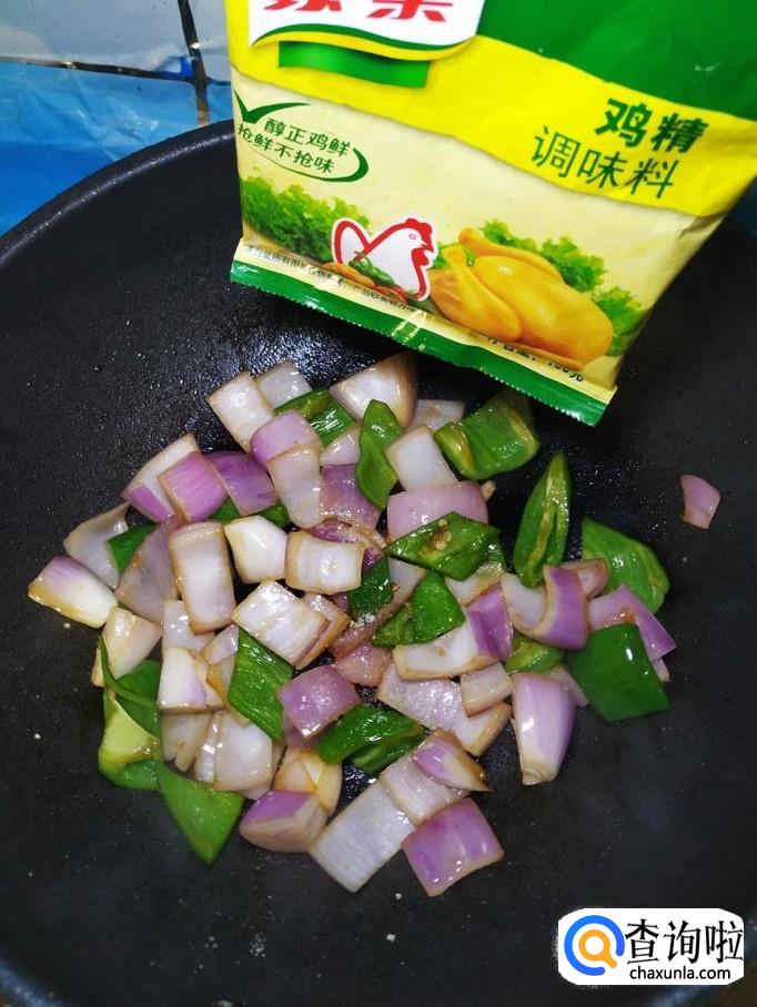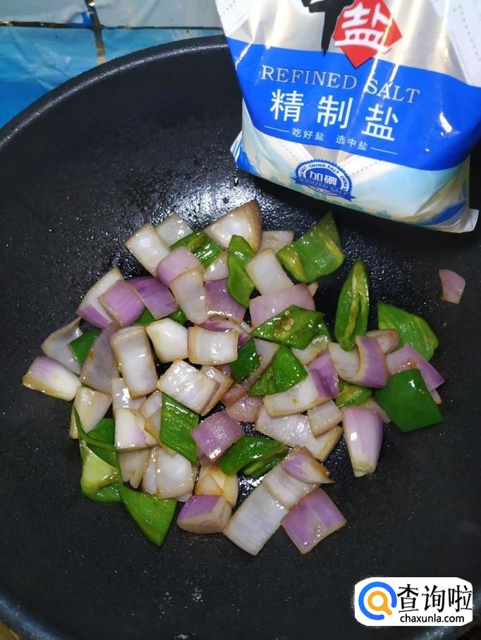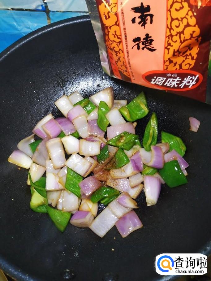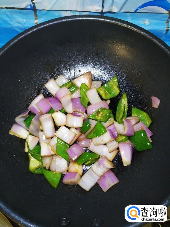 炒锅中放入适量油,油热后,放入白砂糖,炒出糖色,然后将青椒片和洋葱片儿倒入锅中,翻炒均匀。