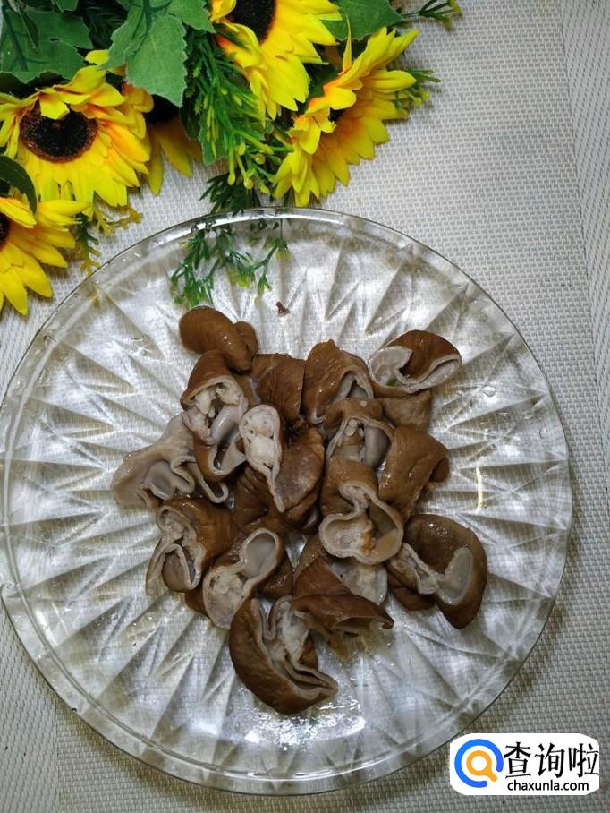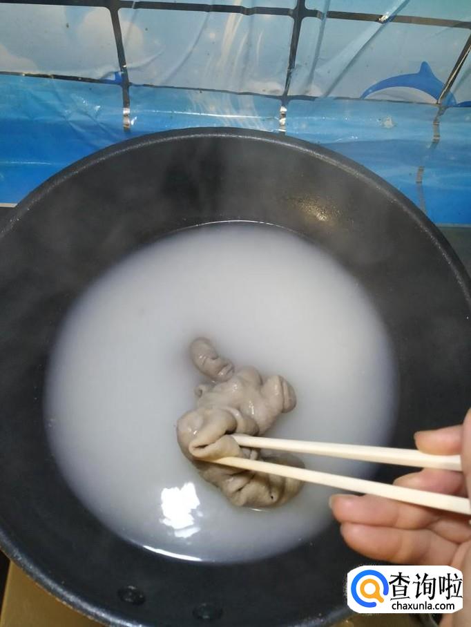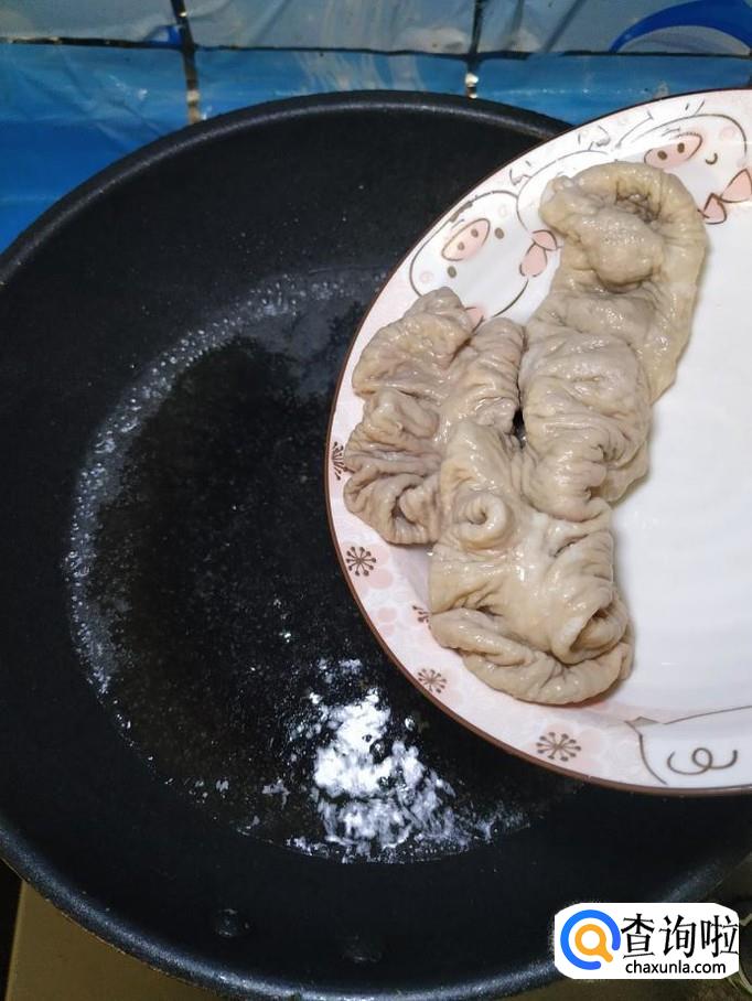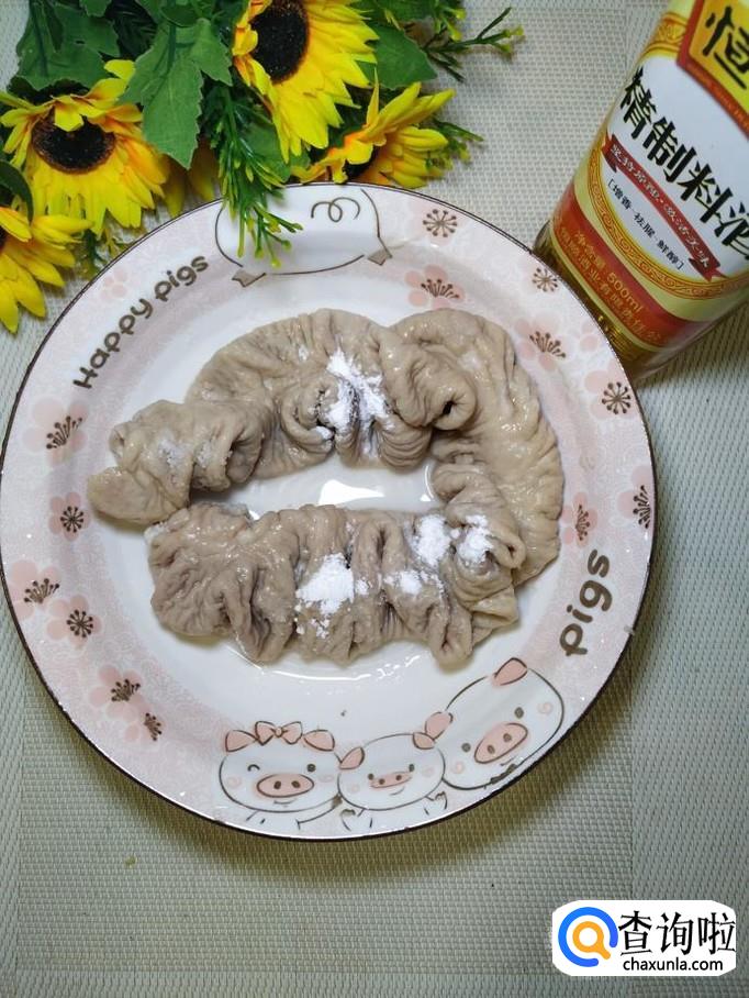 准备一根猪大肠,加入适量食盐,料酒和淀粉,用手使劲的搓洗,洗好之后放入锅中焯水,焯好之后,捞出备用。