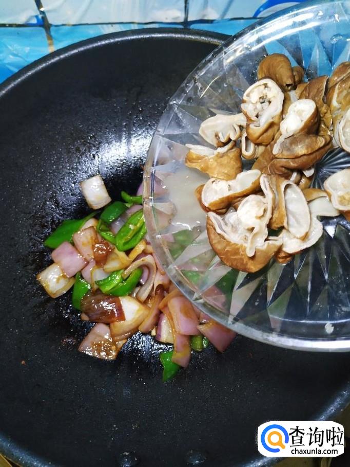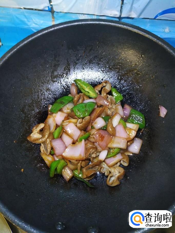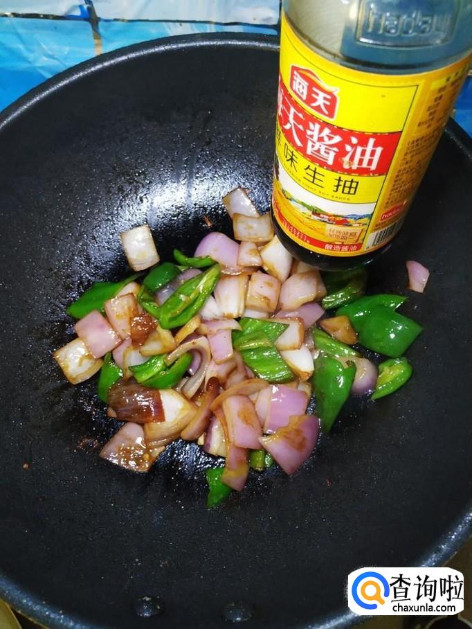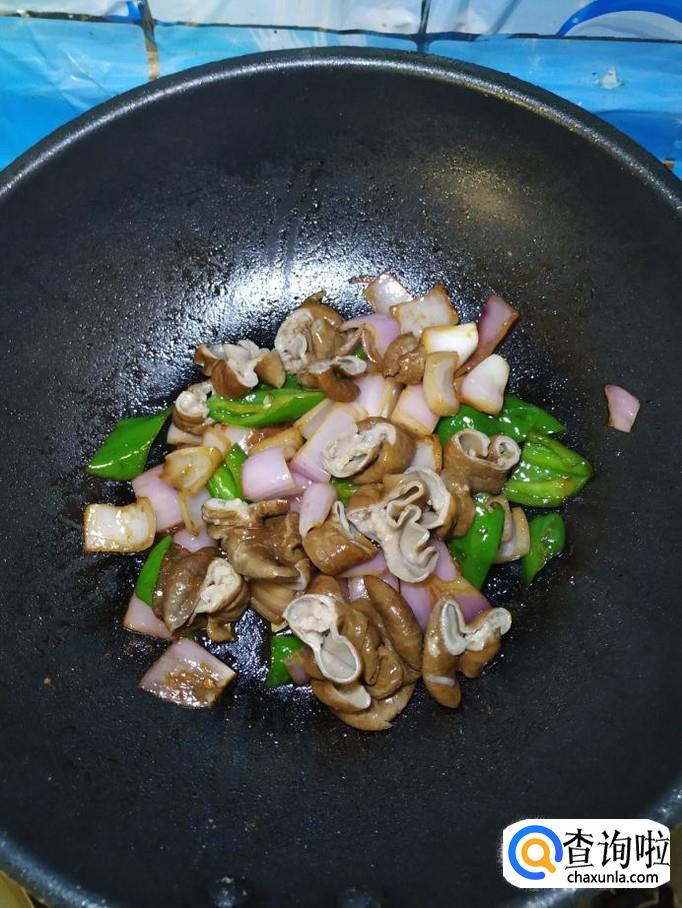 加入适量生抽,再将之前切好的猪大肠倒入锅中,翻炒均匀。