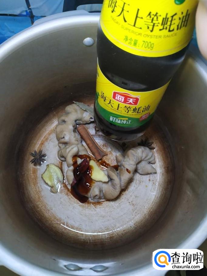 将焯好水的猪大肠放入高压锅中,用适量姜片,干辣椒,桂皮,花椒,八角,加入适量蚝油。