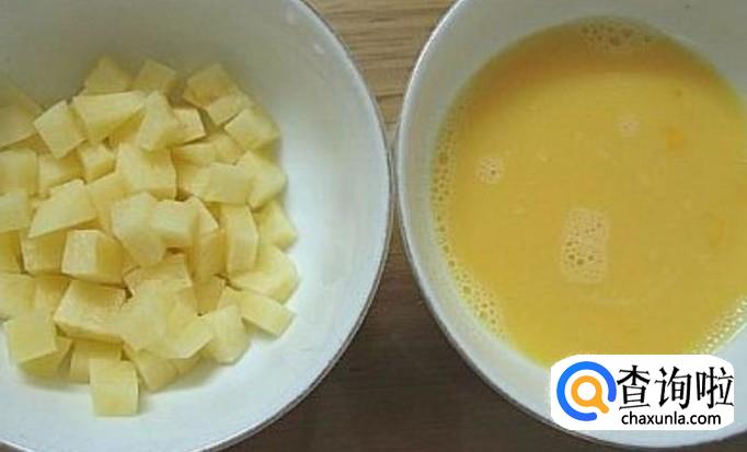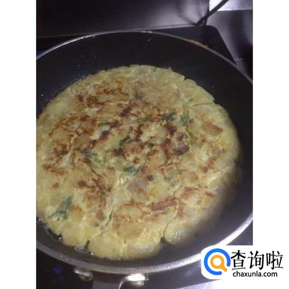 往锅里倒入适量的油,等到油烧热以后把准备好的鸡蛋液和土豆倒入锅中,等到一面差不多煎好以后再翻面就可以了,熟透以后就可以盛出来了。
