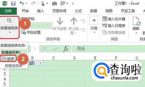 接下来返回到表格,在左上角点击“数据透视表”下方的三角形下拉按钮,点击下拉菜单中的“选项”;