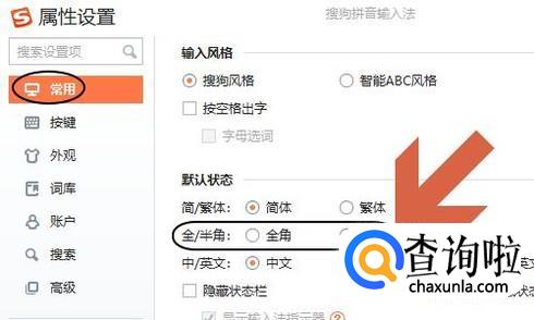 然后在弹出的属性设置对话框勾选左侧的“常用”,对应的右侧页面里也可以手动切换全角和半角两种状态,如图所示...