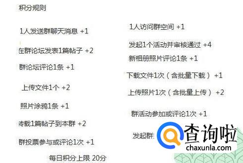 积分是根据咱们在群里面各种操作得来的,比如积极发言、发起活动、上传群文件、图片等,都可以增加积分!(想要积分获取多,个人感觉每天来群里发消息比较快,而且上传文件图片啥的来积分也比较快)