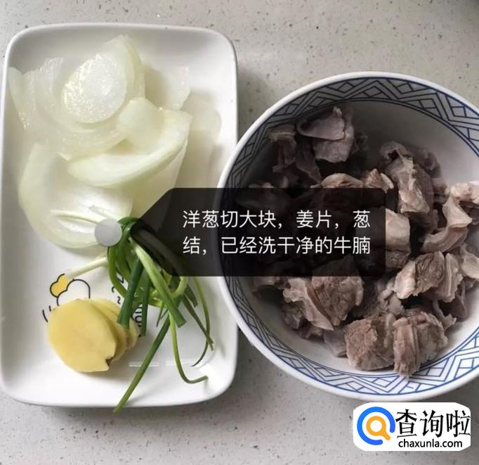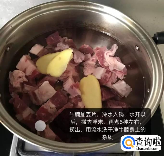 接着锅中放入适量的清水,放入牛腩和姜片,开大火煮,撇去浮沫,再煮五分钟左右,捞出用流水清洗干净,如下图所示。