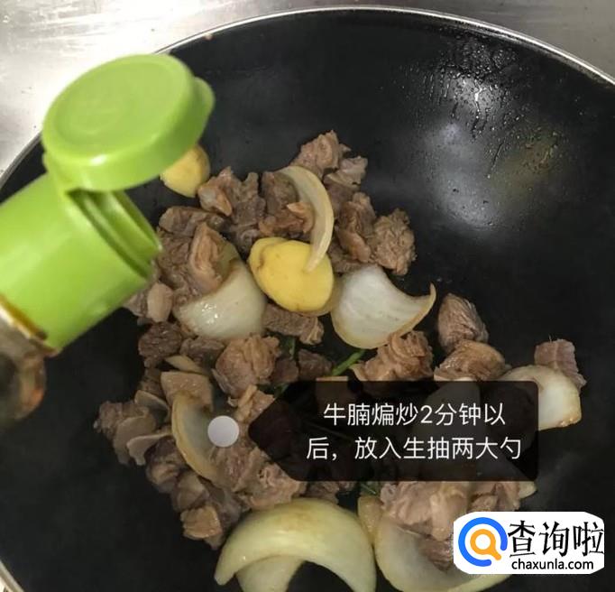 牛腩煸炒两分钟以后,放入两大勺的生抽,如下图所示。