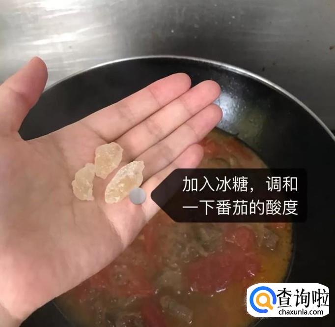 接着往锅中加入适量的冰糖,这样做能够有效的去除番茄中的酸味,如下图所示。