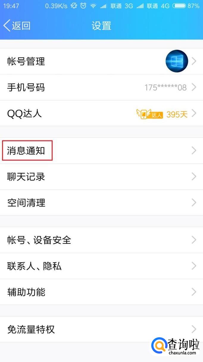 在手机QQ设置页面中,点击“消息通知”菜单选项。
