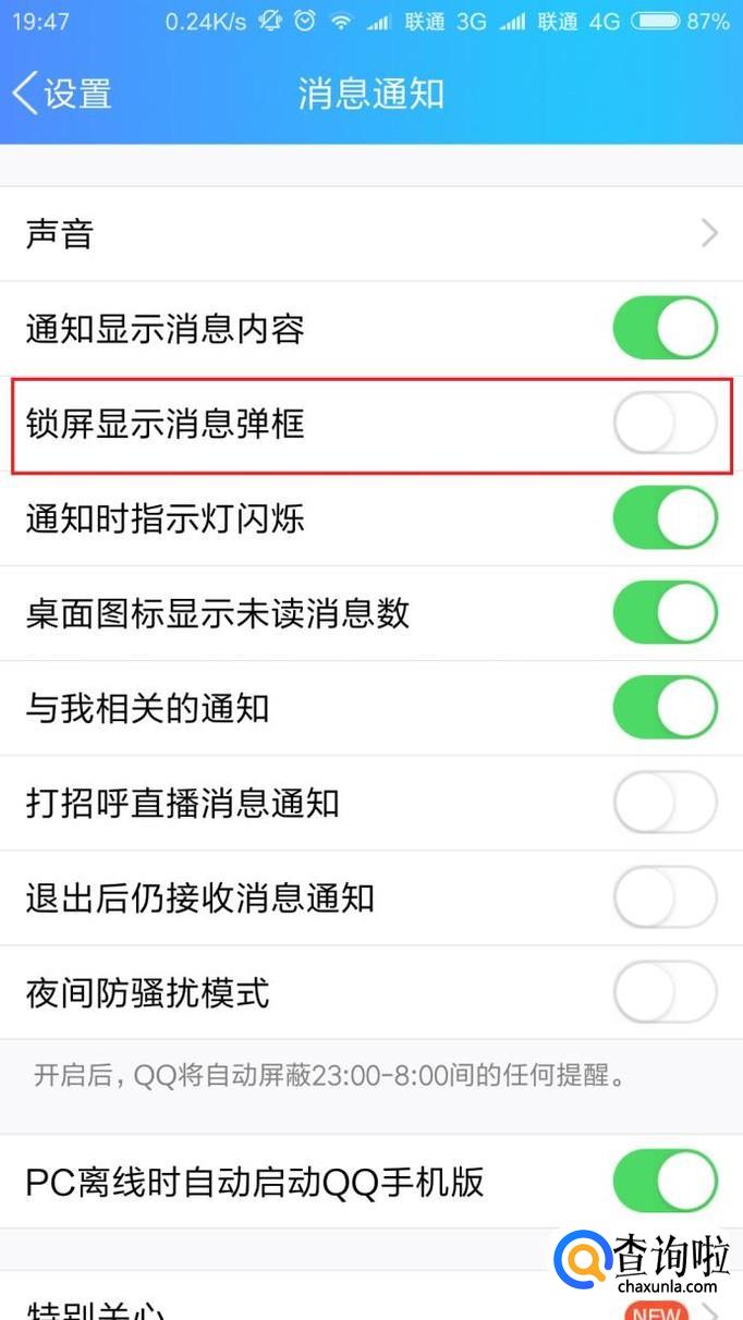 最后,可以看到锁屏显示消息弹框设置选项,点击该设置按钮开关,关闭锁屏显示消息功能即可。