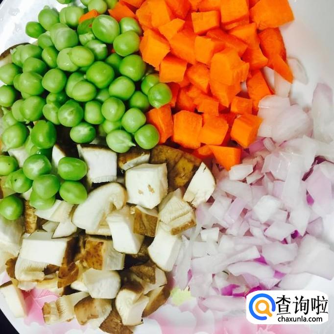 隔夜米饭一碗、葱姜蒜适量、鸡蛋三个、豌豆、胡萝卜、香菇、洋葱、西葫芦、香肠一根
