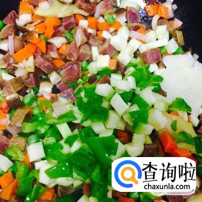 接着放入葱姜蒜和洋葱粒煸炒,这一步一定要有啊,真的很香很香,爱吃辣的可以再加几个干辣椒,然后放香肠炒出油再加焯过水的豌豆胡萝卜香菇,最后放青椒和西葫芦粒炒匀出锅,注意不要炒太久,半熟就可以了