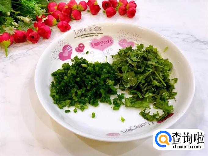 准备好适量的香菜和小葱分别洗干净,切成小段备用。