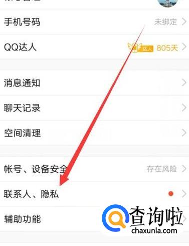 进入之后,点击“联系人、隐私”,进入下一页面,如图所示。