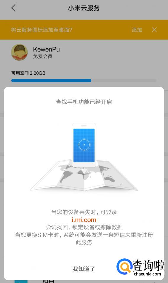 然后会弹出一个对话框,点击【知道了】后就可以开启查找手机功能了。