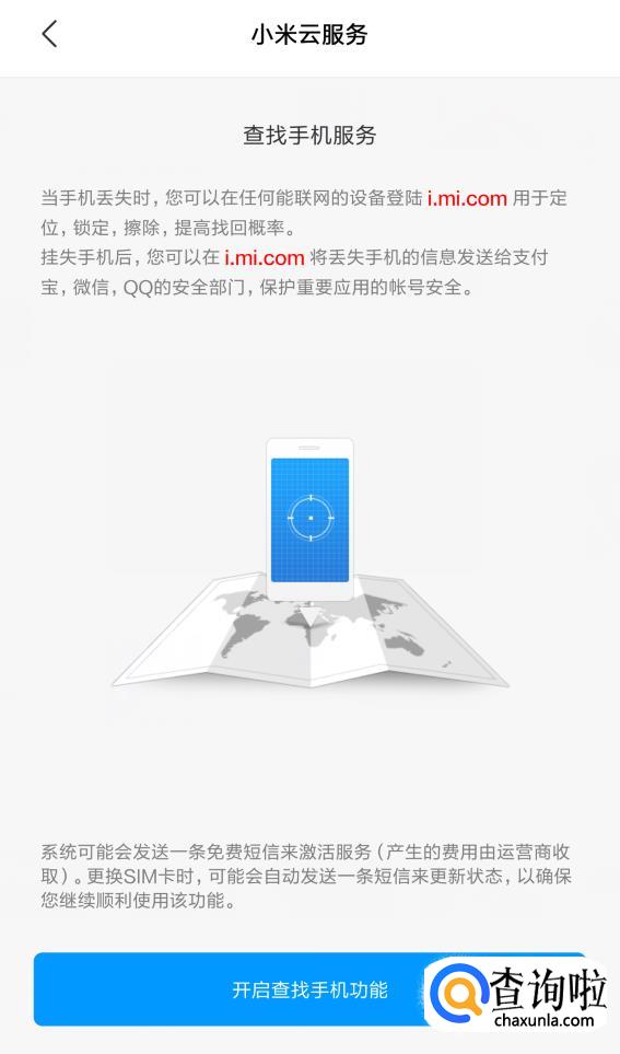 来到了查找手机的页面之后,我们可以看到系统对于查找手机服务的说明,然后点击下方【开启查找手机功能】。