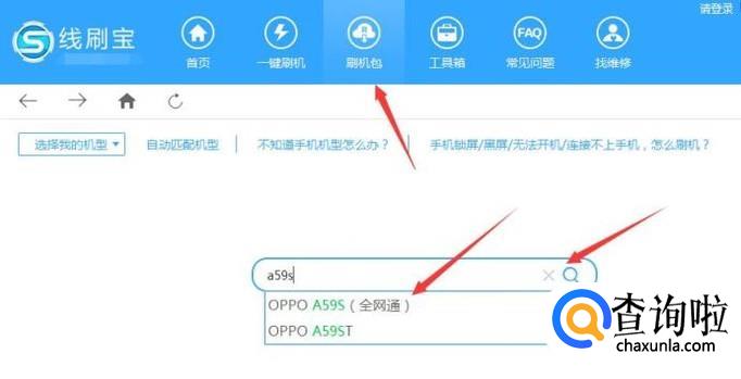 连接成功后,我们在点击顶部的“刷机包”栏目进入,在搜索框内输入“a59s”系统会自动匹配,然后我们点击搜索。