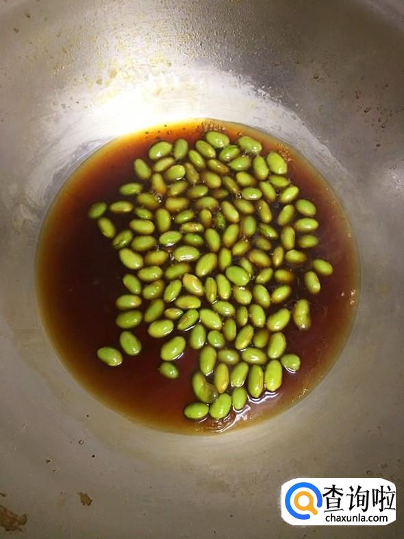 毛豆米放入锅中,加入少许水,再依次加入1小勺生抽、香醋和白糖,大火煮开。