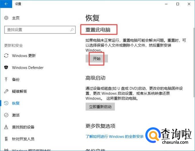 弹出的界面,我们看到重置此电脑,我们点击开始;