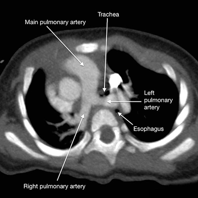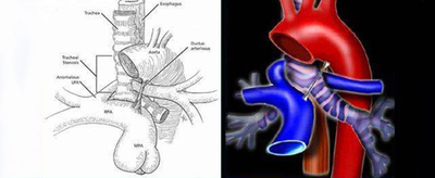 肺动脉吊带是一种罕见的先天性心血管畸形,又名迷走左肺动脉,是左肺动脉异常起源于右肺动脉的后方,呈半环形跨过右主支气管向左穿行于食道前和气管后到达左肺门,常合并气管下段、右主支气管和食管不同程度的压迫。此外,动脉导管或韧带向左后方与降主动脉相连,此结构和异常的左肺动脉一起形成的血管环可压迫左主支气管。