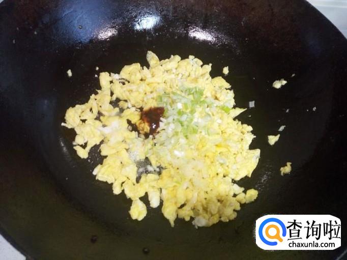 油凉后,放入炒好的鸡蛋,葱姜,放入盐,味精,料酒,少许蚝油,搅拌一下。