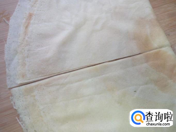 整张的煎饼,对折后用刀切成一半(如果煎饼过于薄,一张煎饼只能做一个韭菜盒子,否则煎塌的时候容易露馅)。