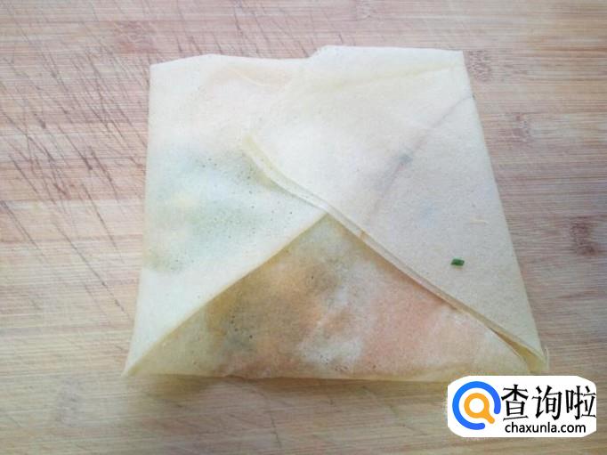 把拌和好的韭菜馅,放入煎饼上,上下折叠,包住韭菜馅,两边再对折包住韭菜馅。然后中间为轴再对折一下成为煎饼盒子形状(放韭菜馅的时候,略偏放一下,留出对折的空间)。