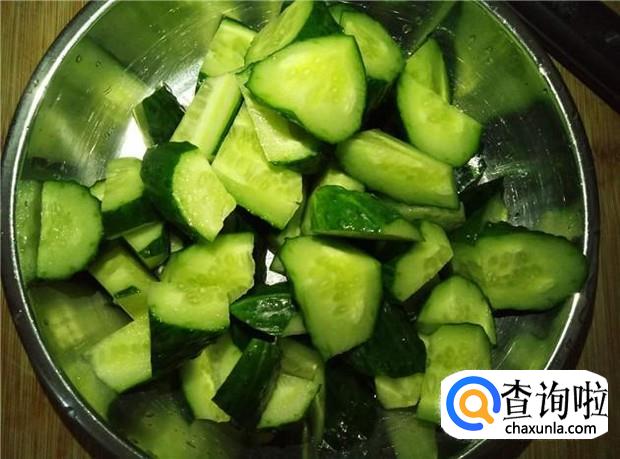 黄瓜清洗干净身上的刺,切掉头尾,然后切成滚刀状,备用。