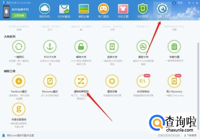 连接成功后,我们点击导航栏目上的“更多工具”进入,我们会看到辅助工具处有个“清除锁屏密码”的功能。