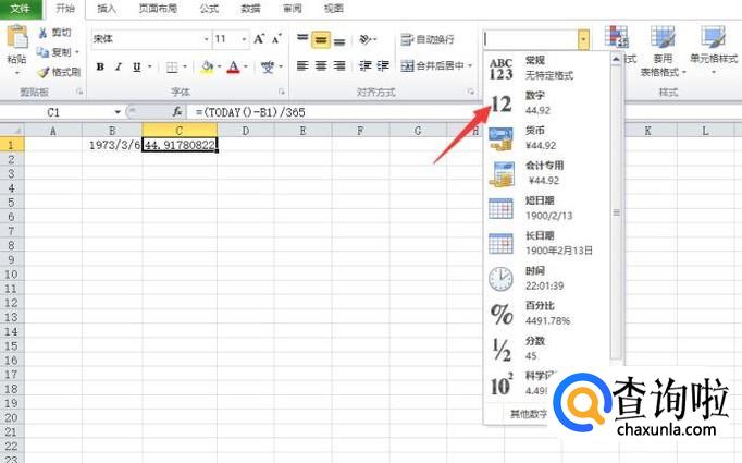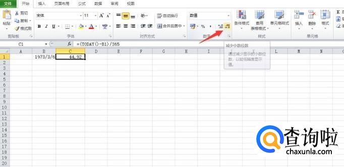 一顿操作之后发现得到的却是一个无限不循环的小数。这时我们可以将次单元格的格式设置为数字,同时减少小数位数,就可以得到年龄了。