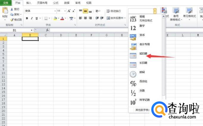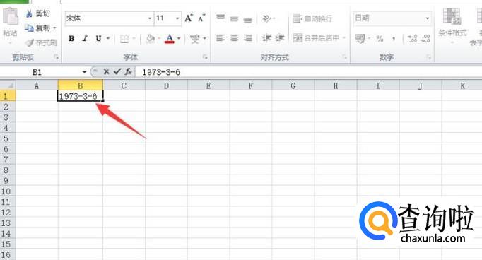 首先,打开EXCEL工具,为了给大家演示我随便选中了B1一格。将这一格的格式设置为“短日期”,并输入一个日期。