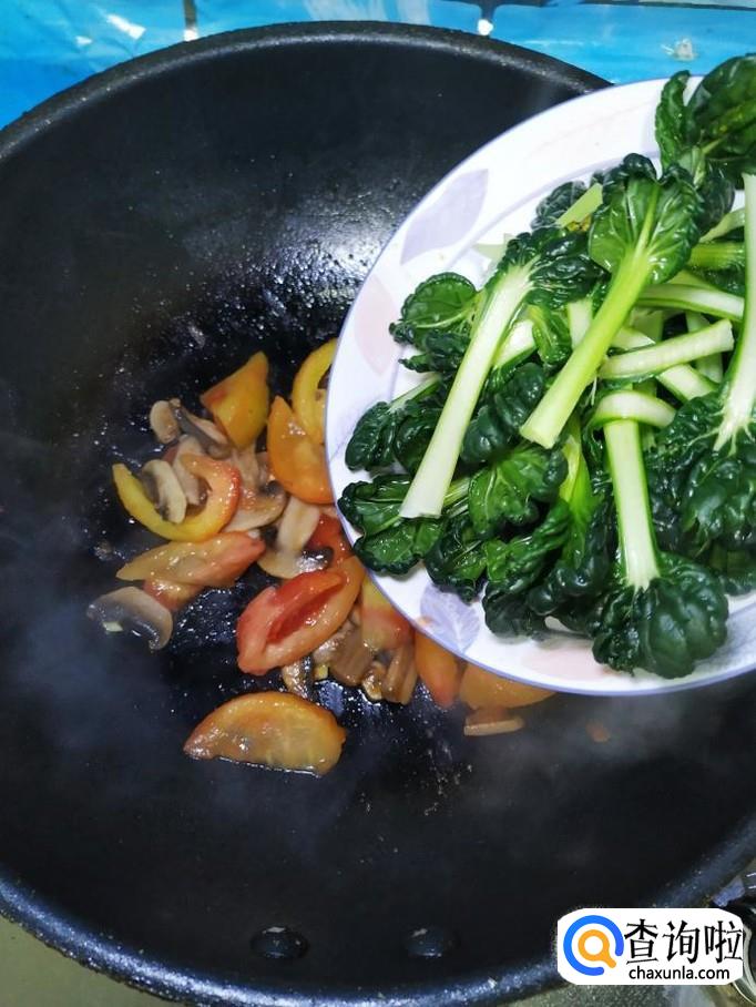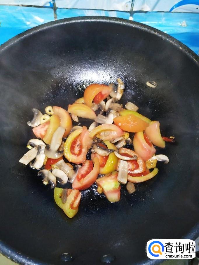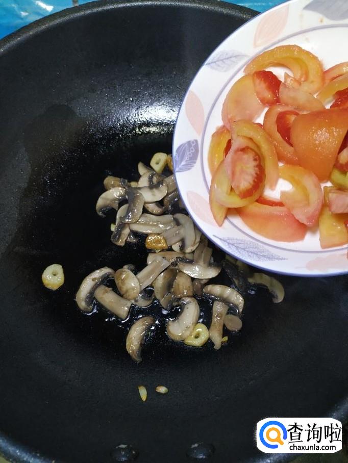 将西红柿倒入锅中,和口蘑一起翻炒均匀。