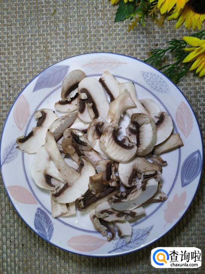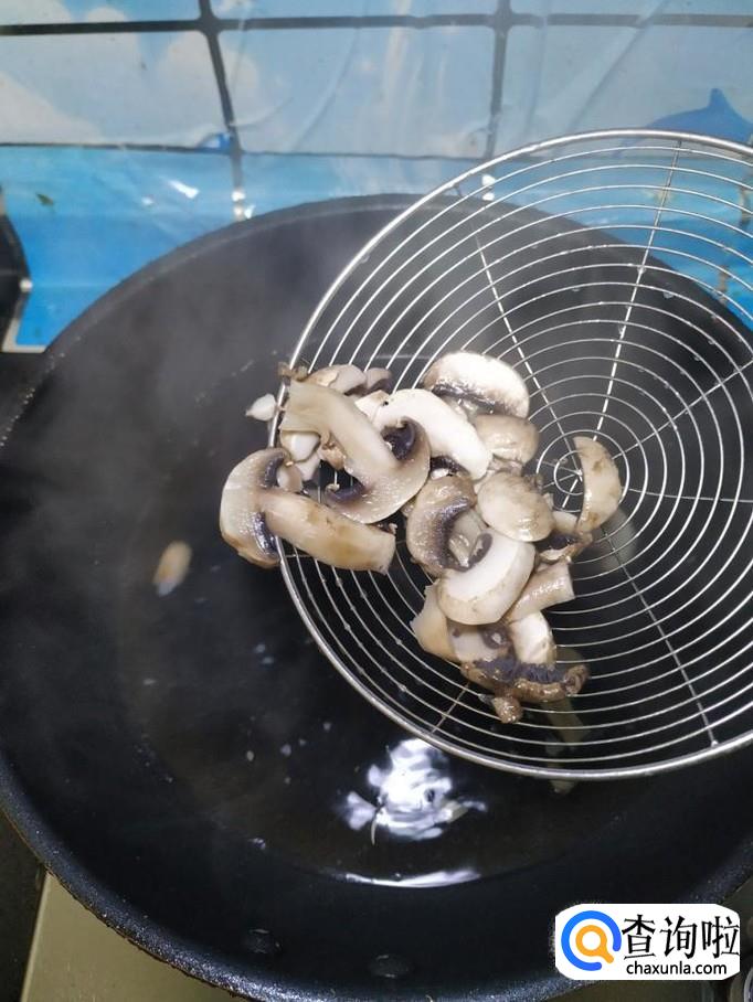 准备适量口蘑,洗净后,切成片,放入锅中焯水,焯好之后,沥干水分,放入盘中备用。