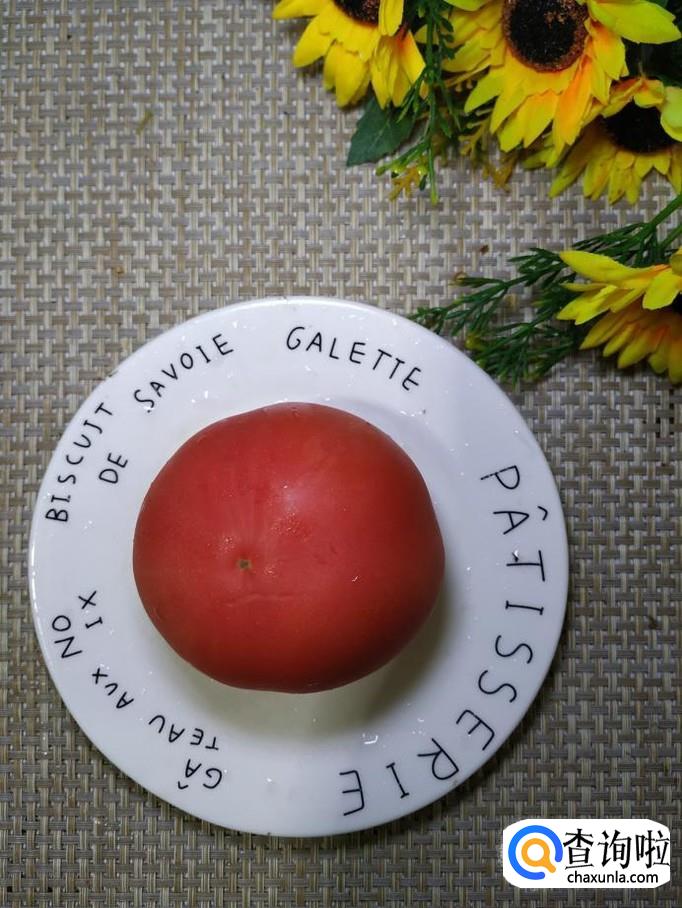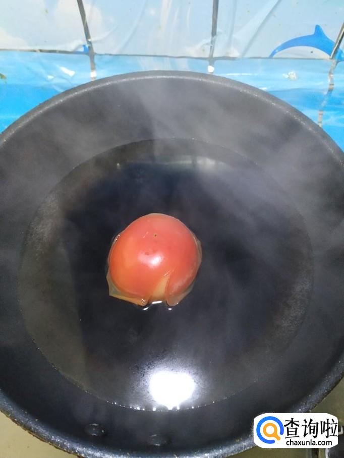 准备一个西红柿,洗净后,放入锅中焯水,焯好之后,去除外皮,切成小块,放入盘中备用。