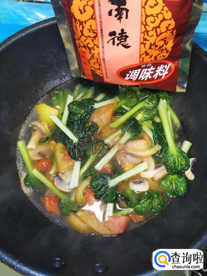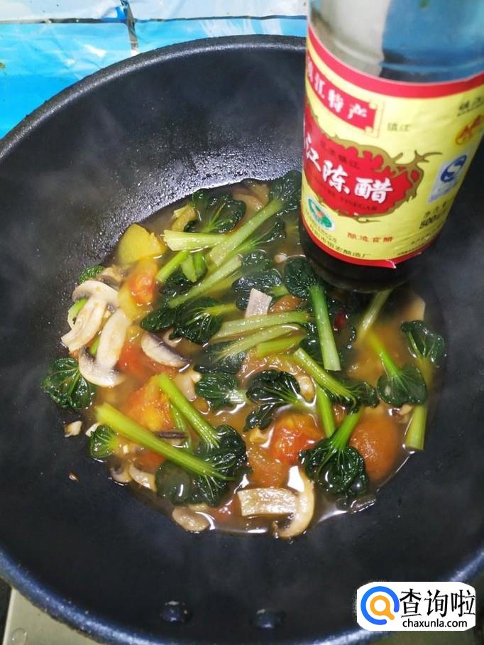西红柿适量,塔菜适量,口蘑适量,大蒜适量,干辣椒适量,盐适量,鸡精适量,五香粉适量,生抽适量,陈醋适量。
