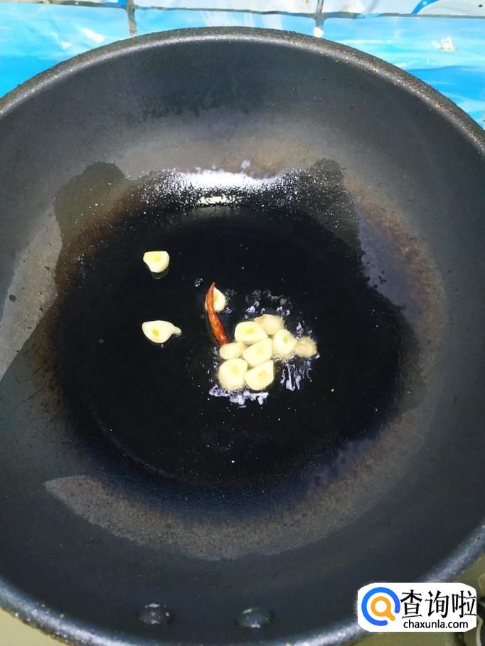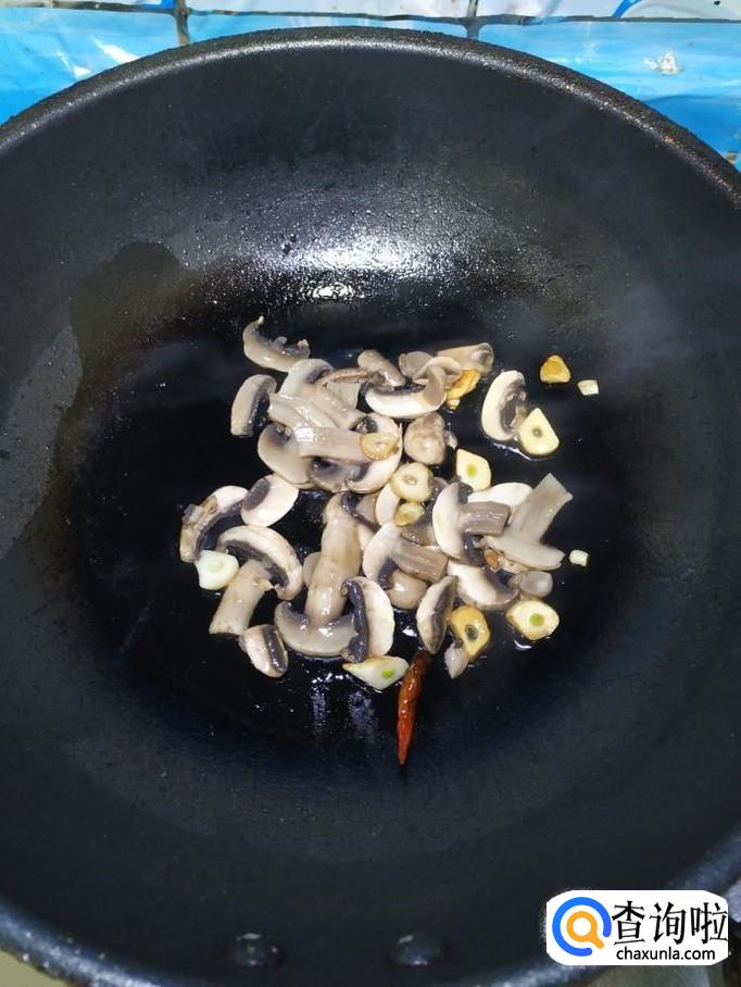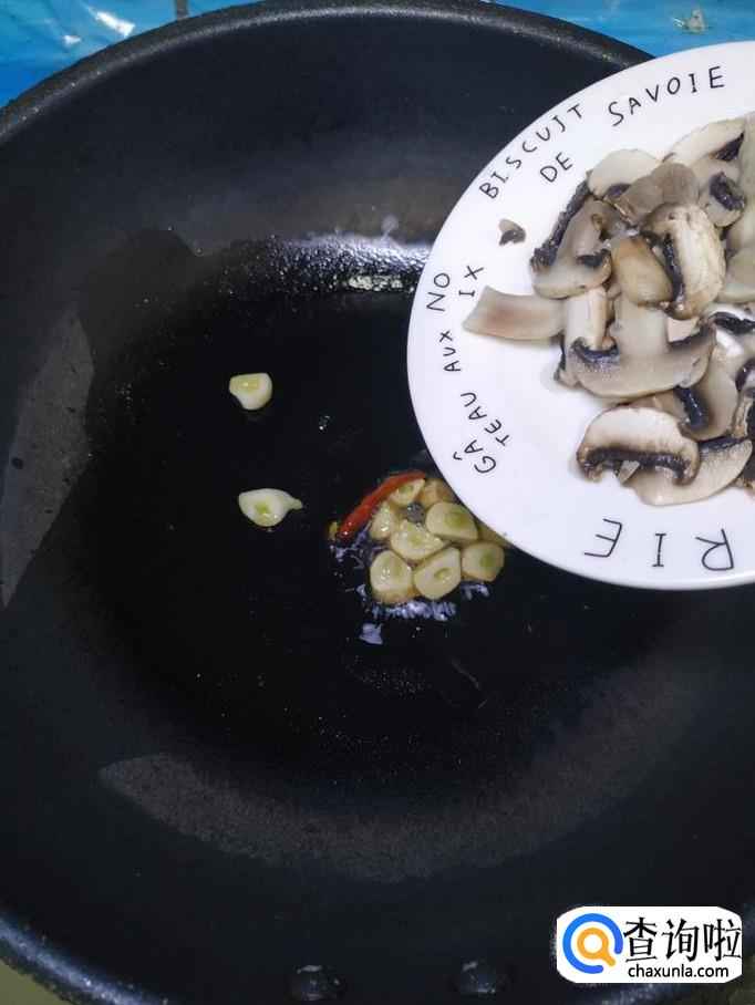 准备适量大蒜,洗净后,切成片,炒锅中放入适量油,油热后放入蒜片和干辣椒炒香,然后将口蘑倒入锅中,翻炒均匀。