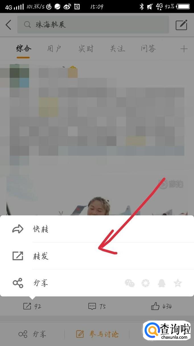 点击“转发”这个选项,如图1箭头所示。你会看到出现一个新的界面,如图2所示。