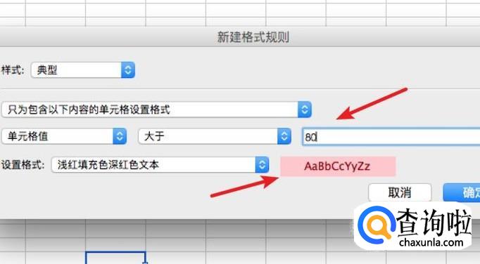 点击后,弹出格式规则窗口,在这里输入数据80,表示是对大于80的数据进行处理。然后选择背景色,点击确定按钮。