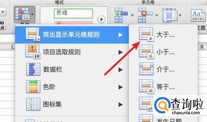 在弹出的子菜单里,我们选择‘突出显示’下的‘大于’,以这个为例子来讲解使用。