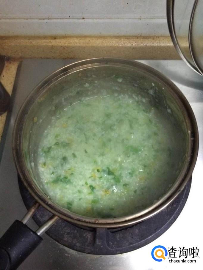 将榨好的菠菜汁倒入锅中,倒入淘洗干净的大米,大火烧开小火炖50分钟,炖至大米软烂为止。