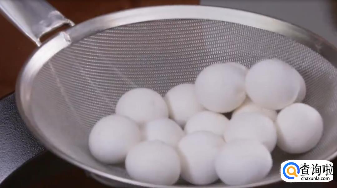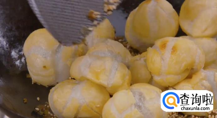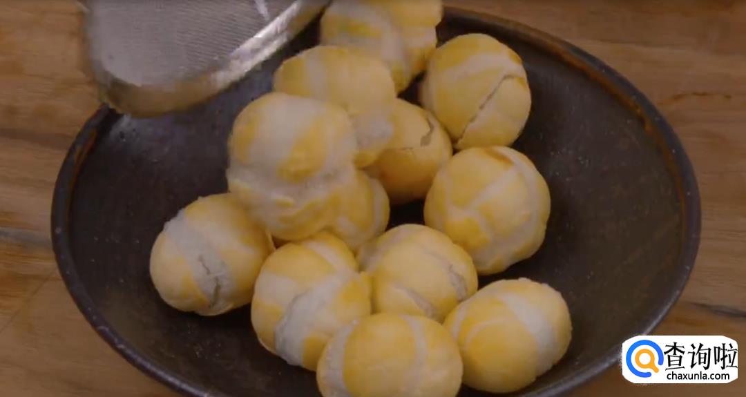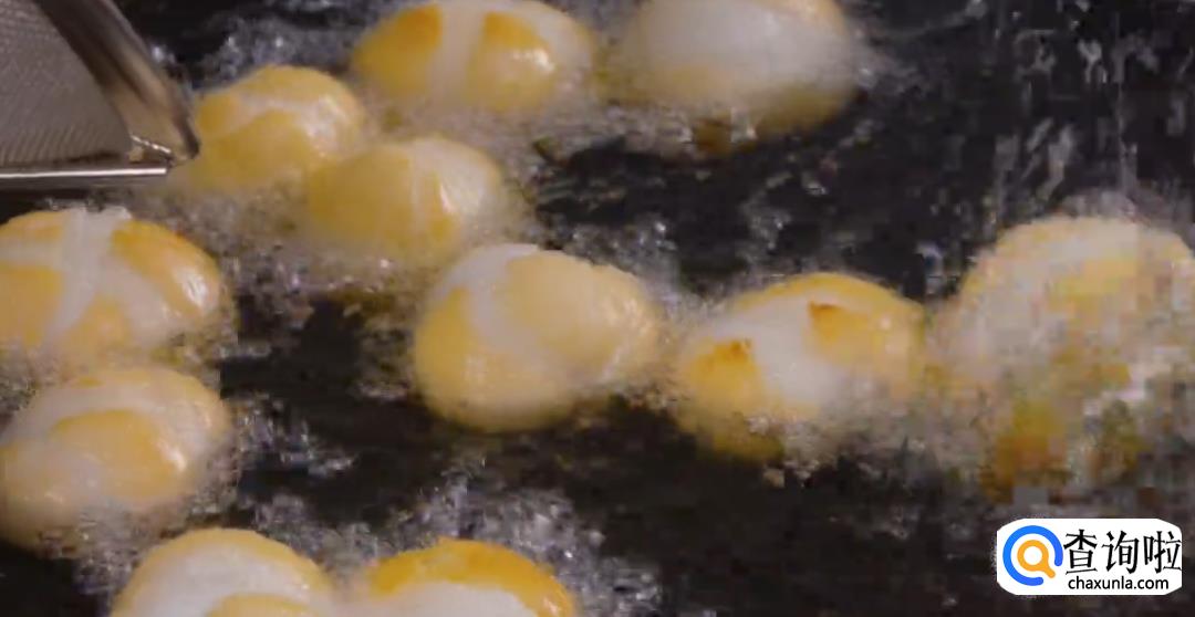 等到汤圆七成熟,晃动漏勺避免粘连,将其倒入油锅继续炸至表皮焦黄,然后捞出滤干。