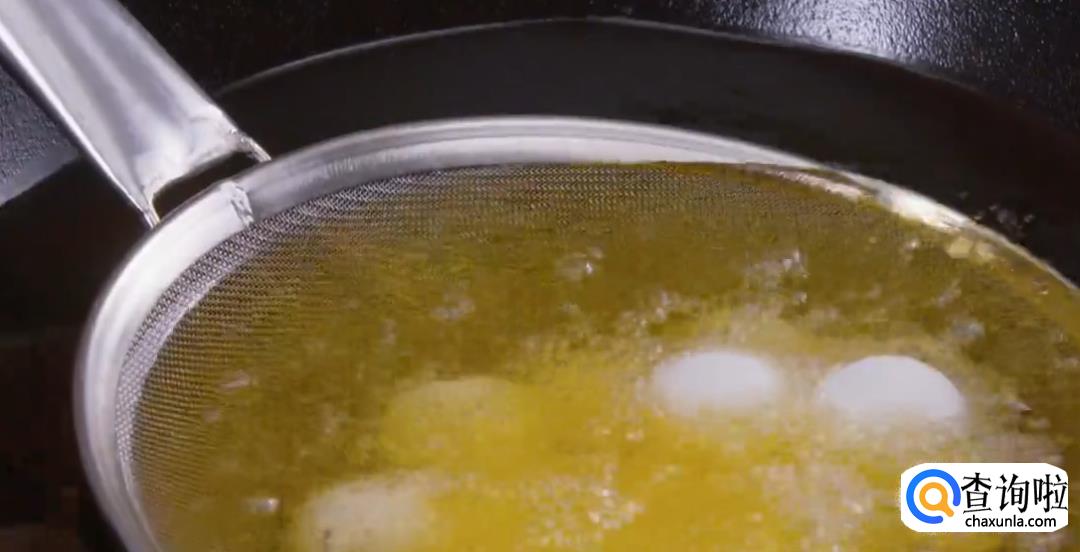 准备一锅热油,六成熟的时候,将汤圆放入漏勺,进油锅炸。