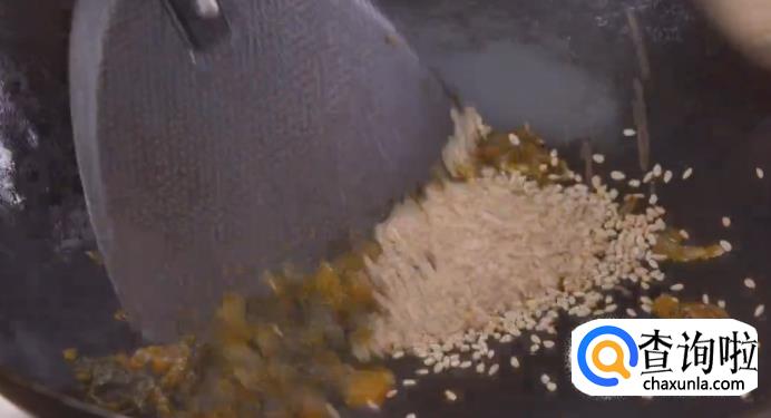 热锅起油,下芽菜和白芝麻翻炒爆香。