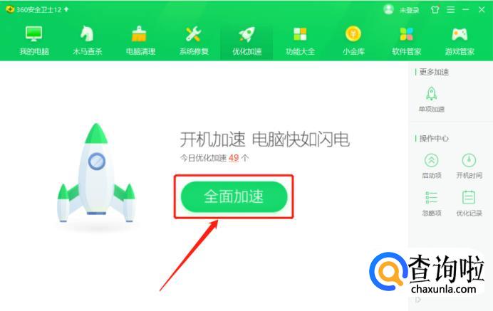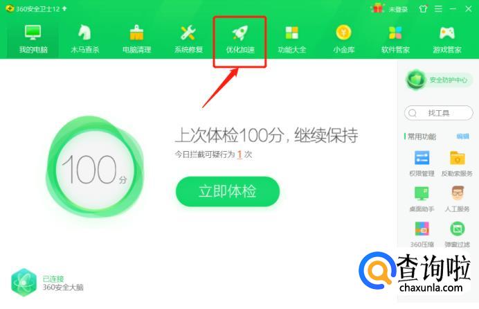 首先我们先打开【安全卫士】,点击进入到主界面。点击上面的【优化加速】功能选项,进入电脑加速的界面,如图所示。
