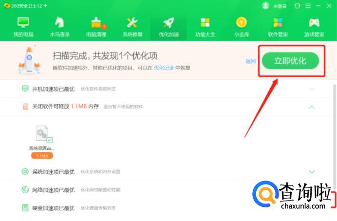 扫描完成后,我们点击全选,然后点击右上方的【立即优化】,如图所示。