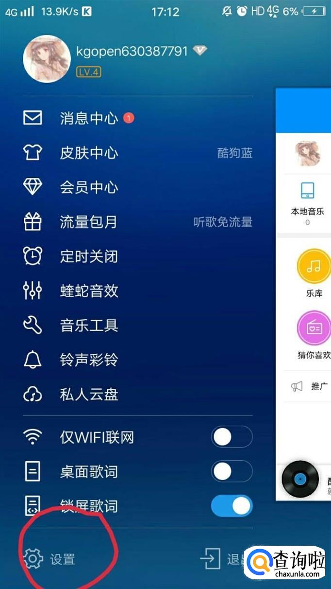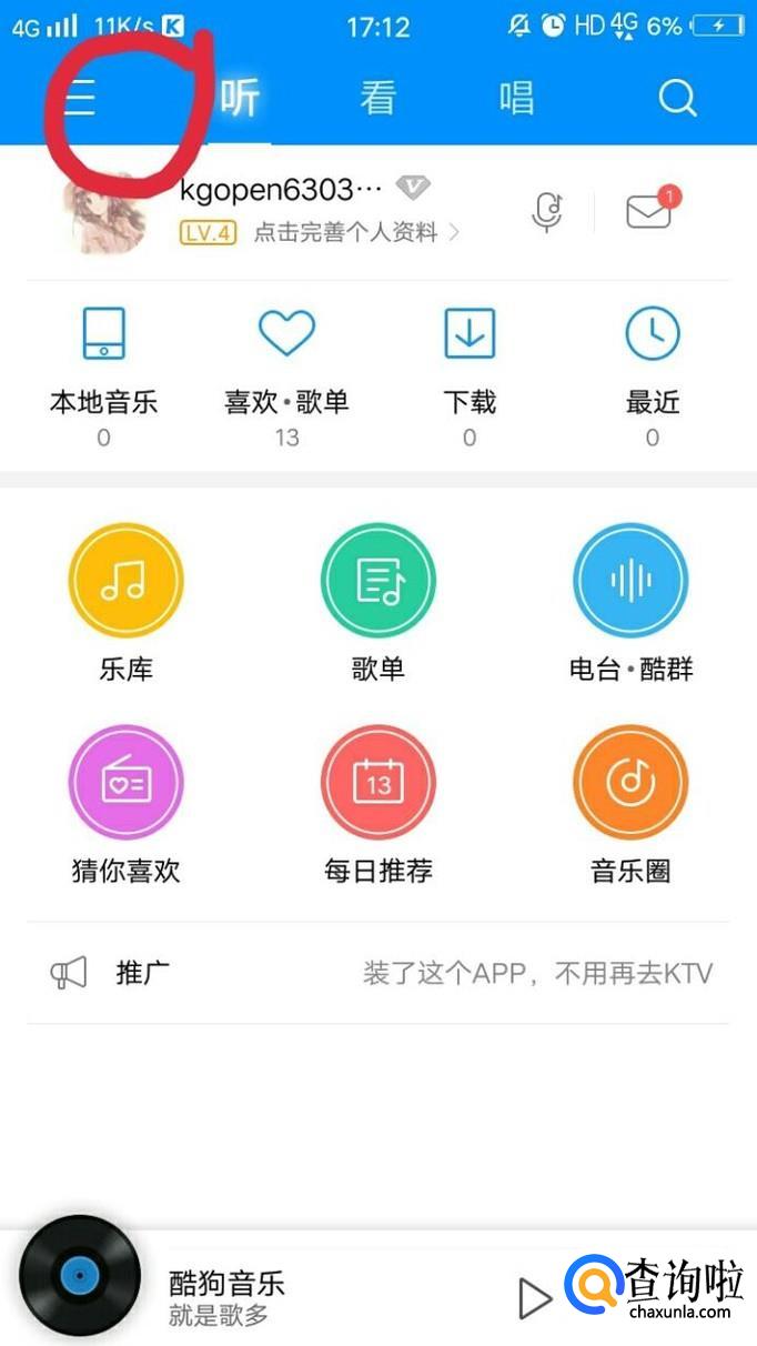 首先打开酷狗音乐,然后点击左上角的三条横线。