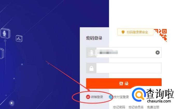 来到淘宝网的登陆网页,点击【新浪微博】即可使用微博账号登陆,如下图所示: